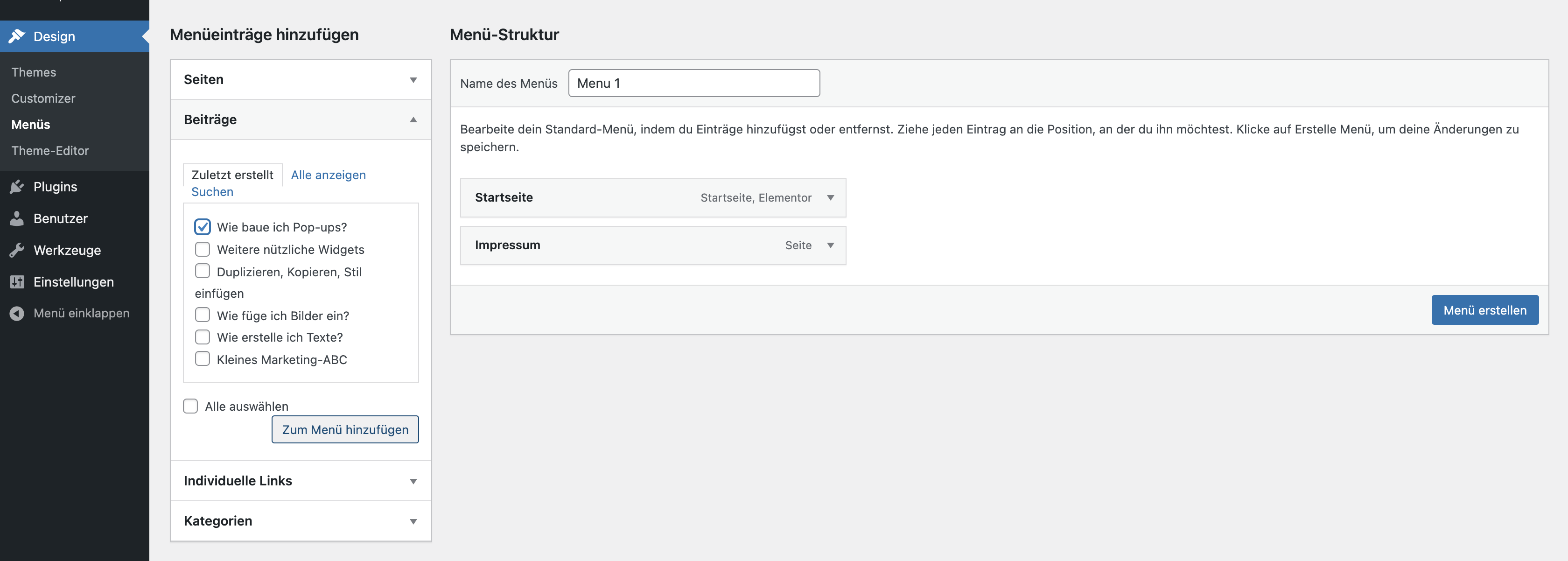 Sie gehen im Back-End auf den Reiter „Design“ und wählen dann „Menüs“ aus. Unter Menüeinträge kann man Seiten, Beiträge, individuelle Links oder Kategorien einfügen, indem man sie auswählt und dann auf „Zum Menü hinzufügen“ klickt. Dann erscheint das Menüelement in der Menüstruktur rechts. Sie können die einzelnen Menüelemente per Drag and Drop anordnen oder Hierarchien erzeugen. Zum Schluss speichern.
