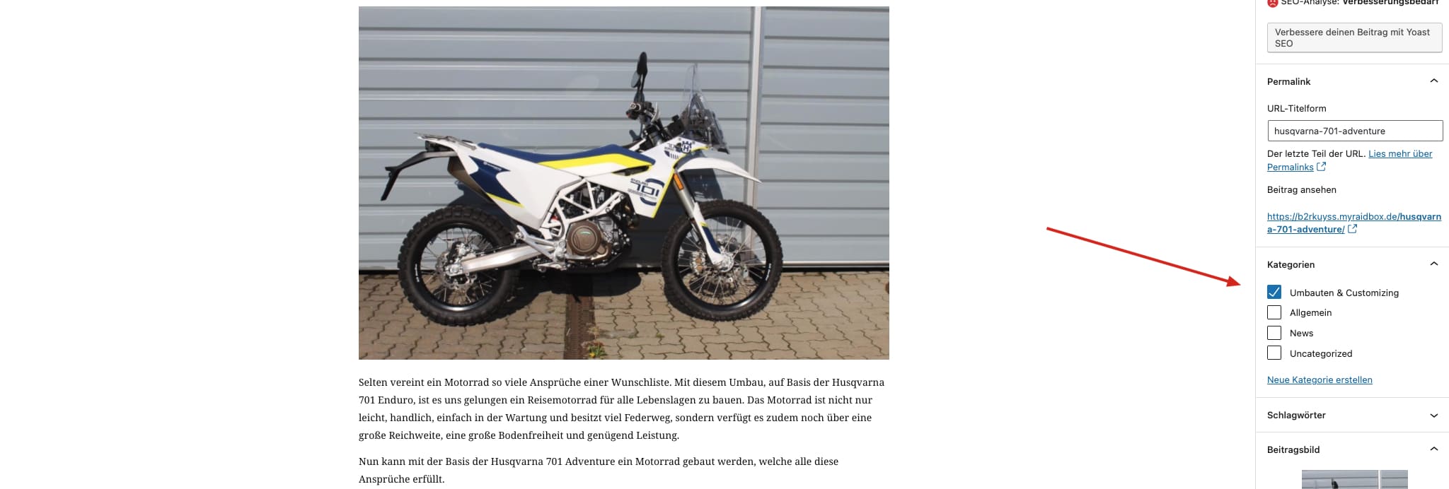Sie starten im Back-End und wählen den Beitrag aus, dem Sie eine Kategorie zuordnen wollen. Dafür klicken Sie auf „Bearbeiten“. Auf der linken Seite erscheint ein Reiter mit Kategorien. Da können Sie einen Haken bei der Kategorie setzten, in der der Beitrag angezeigt werden soll.