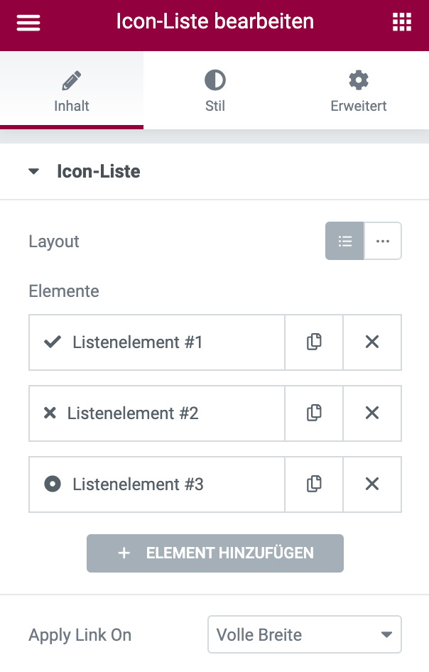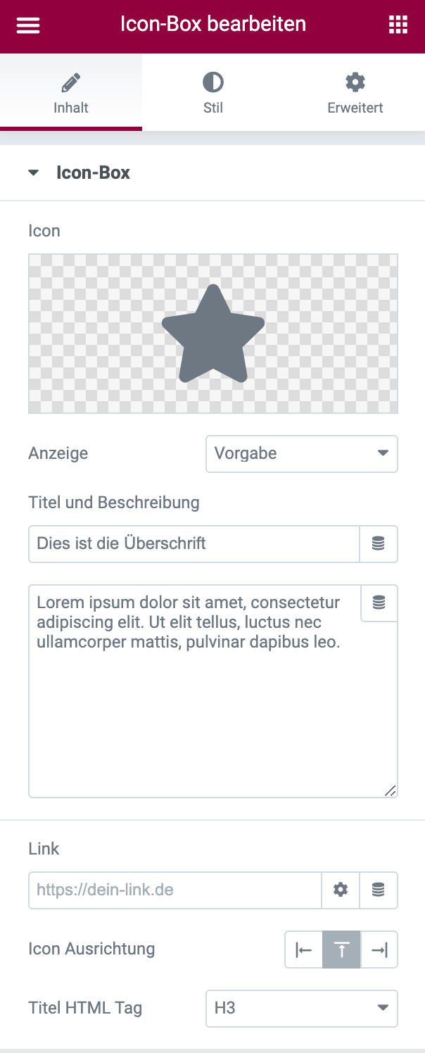 Wählen Sie aus einer großen Auswahl an Icons Ihre gewünschte Grafik. Der Vorteil von Icons: Sie zeigen dem Leser schnell worum es geht und unterstreichen die Aussage. Zusätzlich können die Icons mit einem Link versehen werden und in Farbe und Größe angepasst werden.