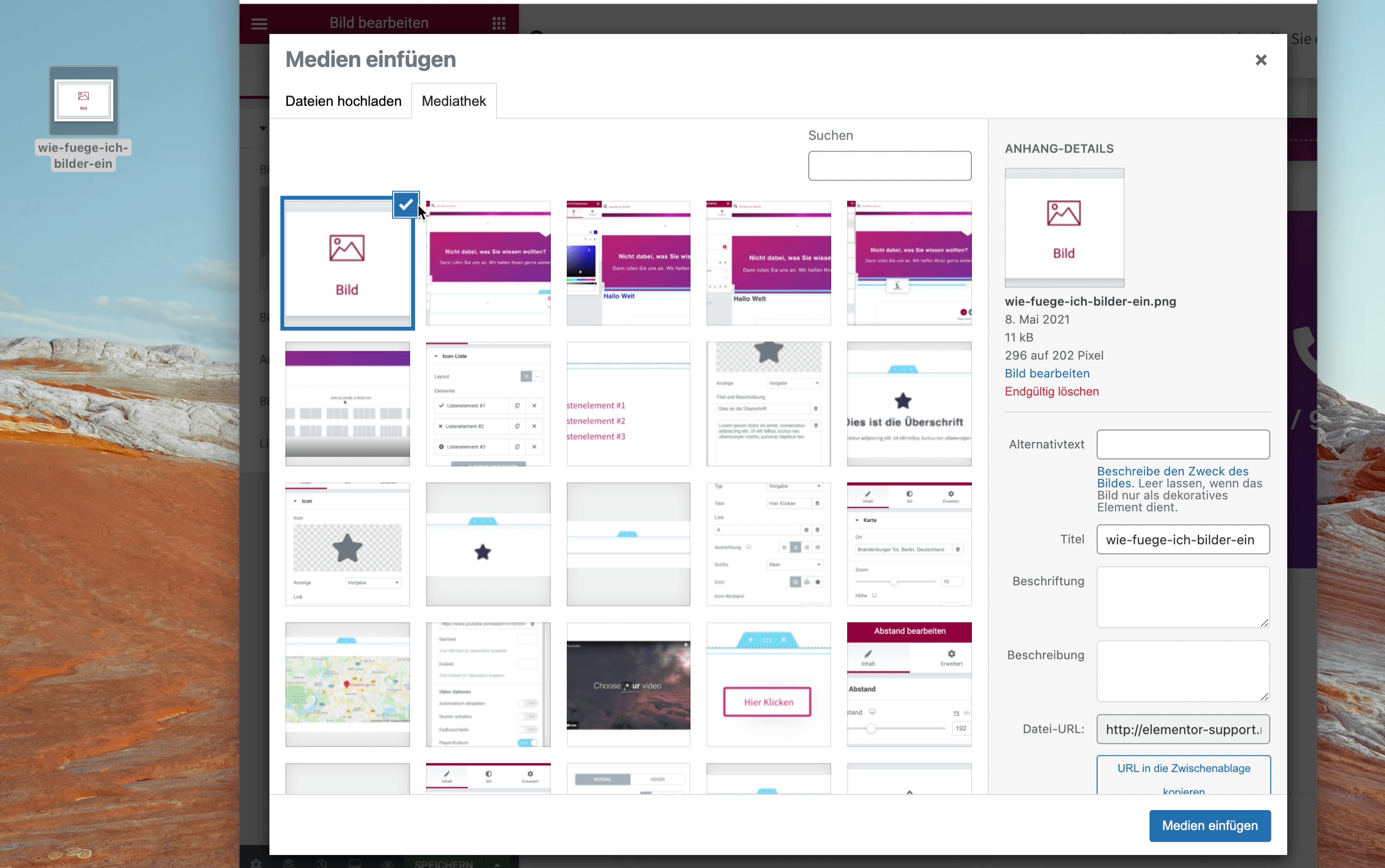 Wir klicken bei „Inhalt“ auf das Bild und fügen ein Bild in die Mediathek ein oder wählen ein bereits eingefügtes Bild in der Mediathek aus.