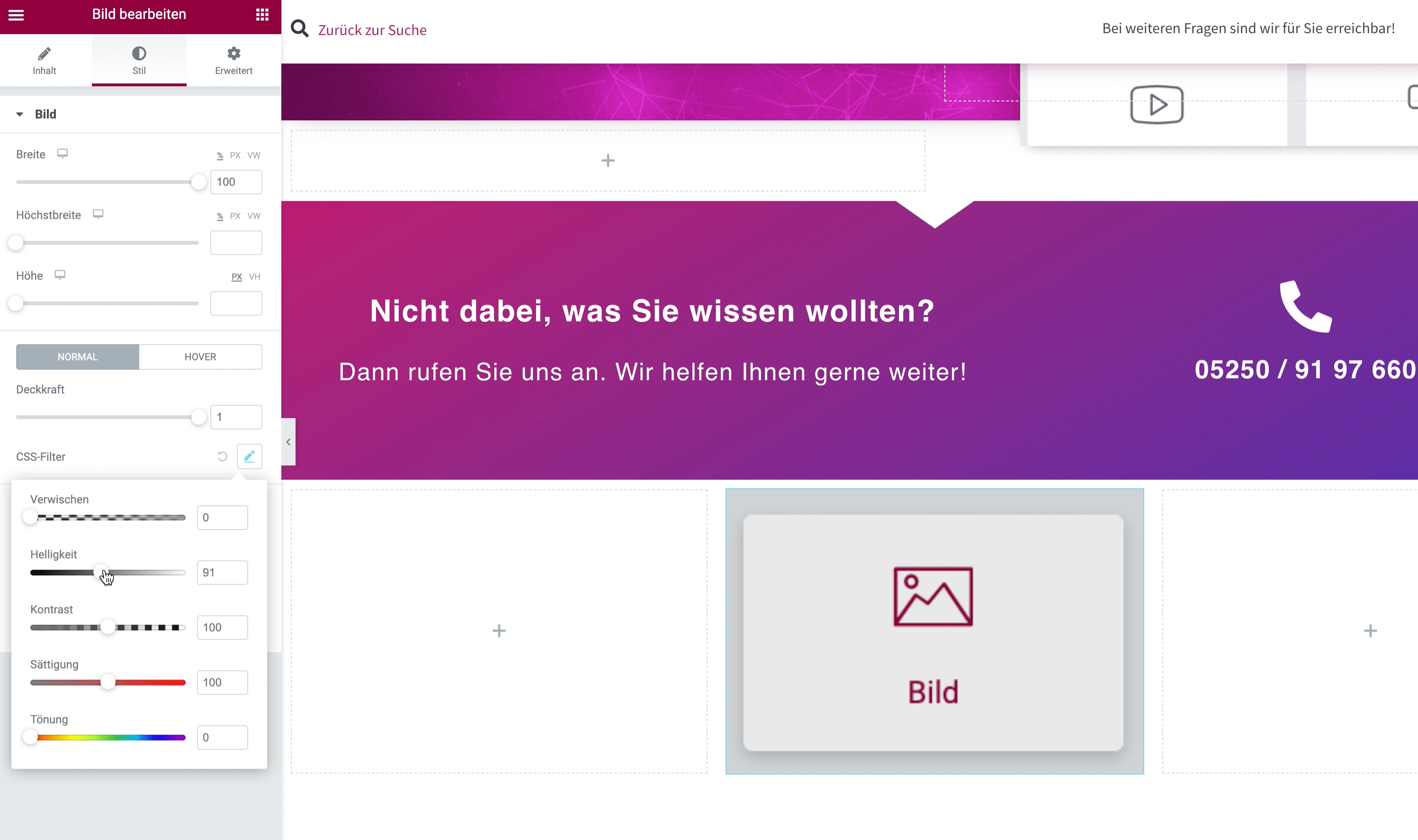 Anschließend können wir die Breite, Hover-Effekte, CSS-Filter etc. unter „Stil“ bearbeiten. Unter „Erweitert“ können Sie den Abstand zu anderen Abschnitten oder Widgets einstellen.